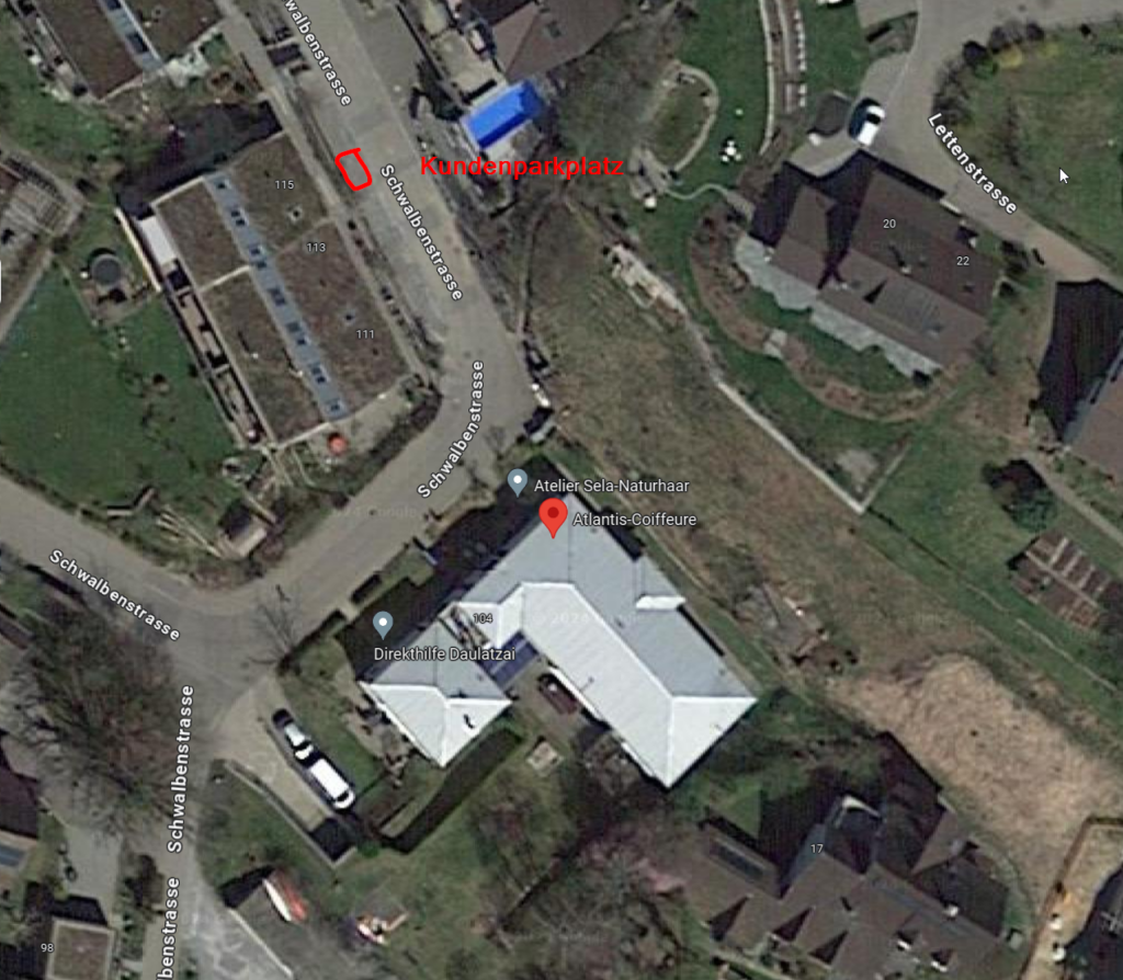 Ein gekennzeichneter Kundenparkplatz steht an der Schwalbenstrasse 115 zur Verfügung.
